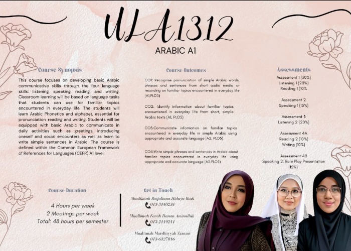 PEKAN, 2 Oktober 2025 - Kursus ULA1312 Arabic A1 merupakan kursus pengenalan bahasa Arab yang baru diperkenalkan di universiti pada Semester 2, Sesi Akademik 2024/2025. Kursus ini menggantikan dua kursus lama yang pernah ditawarkan sebelum ini, iaitu UHF1141 Arabic for Beginners dan UHF2141 Arabic for Intermediate. Perubahan ini adalah sebahagian daripada usaha penstrukturan semula kurikulum bahasa asing di bawah kerangka Common European Framework of Reference for Languages (CEFR), bagi memastikan keseragaman tahap kemahiran bahasa yang lebih tepat, sistematik dan berstandard antarabangsa.