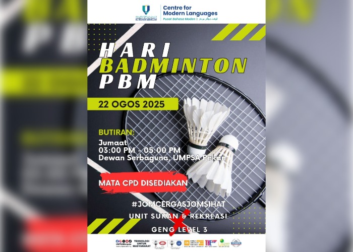 Pada 22 Ogos 2025, Unit Sukan dan Rekreasi Pusat Bahasa Moden (PBM) telah menganjurkan Hari Badminton PBM di Dewan Serbaguna Universiti Malaysia Pahang Al-Sultan Abdullah (UMPSA), Pekan. Dari pukul tiga hingga lima petang, raket dikilas dan dihayun tanpa henti. Seramai 13 staf PBM turun ke gelanggang; ada yang mahu mengasah ketajaman pukulan, ada pula yang sekadar mahu mengeluarkan peluh selepas seharian bekerja, dan yang pastinya, semua mahu melepaskan tekanan.
