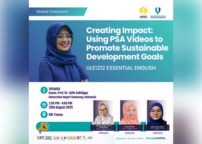 The two-hour session, conducted from 2:00 to 4:00 p.m., featured Associate Professor Dr. Zulfa Sakhiyya from Universitas Negeri Semarang, Indonesia, who delivered a lecture titled “Creating Impact: Using PSA Videos to Promote Sustainable Development Goals.”