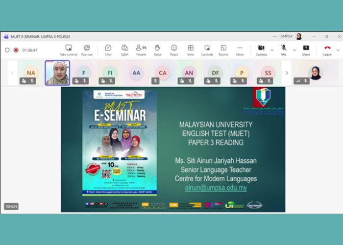 10 April 2026 – The Centre for Modern Languages, UMPSA, in collaboration with the General Studies Department, Politeknik Sultan Haji Ahmad Shah (POLISAS), successfully organised an engaging and comprehensive MUET E-Seminar as part of the preparations for MUET Session 1 2026. The online event aimed to support students in enhancing their English language proficiency while equipping them with the confidence to achieve their desired Malaysian University English Test (MUET) band scores.