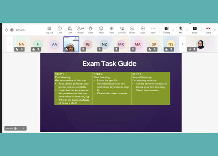 At 10:00 a.m., participants engaged in the Listening session facilitated by Nor Aini Hussain, an instructor from POLISAS. The seminar concluded with the Speaking component at 11:00 a.m., delivered by Hamizah Zahari, a senior language teacher from UMPSA.
