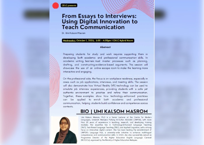 Dalam program lima hari yang berlangsung dari 29 September hingga 3 Oktober 2025, wakil UMPSA, Dr. Umi Kalsom binti Masrom, Pensyarah Kanan dari Pusat Bahasa Moden (PBM), berpeluang menjalankan sesi perkongsian bersama staf Centre for English Language Communication (CELC) dan Centre for Teaching, Learning and Technology (CTLT) di NUS.
