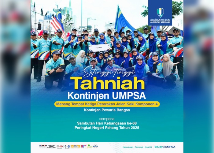 Lebih membanggakan, kontijen UMPSA yang turut disertai oleh dua orang staf PBM memenangi tempat ketiga Perarakan Jalan Kaki Komponen 4 kategori Kontijen Pewaris Bangsa sempena Sambutan Hari Kebangsaan ke-68 Peringkat Negeri Pahang Tahun 2025 yang diketuai oleh Encik Mohammad Hafizi bin Ali dengan sokongan latihan Encik Mohd Rosli bin Harun dari Pusat Keselamatan. Semoga kemenangan ini terus menyemarakkan semangat patriotisme dalam kalangan semua warga UMPSA dan PBM.
