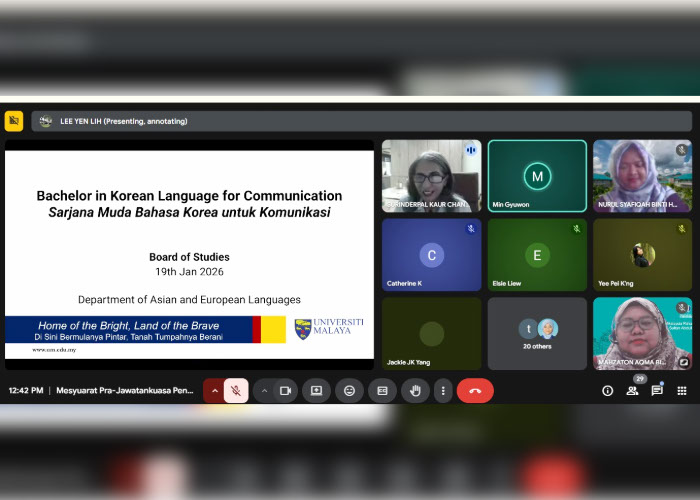 KUALA LUMPUR, 19 Januari 2026 – Mahzaton Aqma dari Pusat Bahasa Moden (PBM) telah mewakili Universiti Malaysia Pahang Al-Sultan Abdullah (UMPSA) dalam Mesyuarat Pra Jawatankuasa Pengajian Fakulti (Pra-JKPF) bagi Program Sarjana Muda Bahasa Korea untuk Komunikasi secara atas talian melalui Google Meet bersama Universiti Malaya (UM).