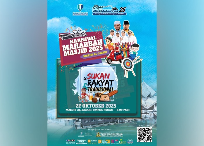 PEKAN, 22 Oktober 2025 – Dari meja pejabat ke padang, seramai 16 staf Pusat Bahasa Moden (PBM) Universiti Malaysia Pahang Al-Sultan Abdullah (UMPSA) tampil menyertai sukan rakyat sempena Karnival Mahabbah Masjid Al-Jazari 2025 anjuran Pusat Islam & Pembangunan Insan (PIMPIN) UMPSA di Dataran Masjid Al-Jazari, Pekan.