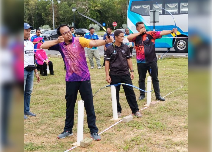 Acara memanah pula menyaksikan dua pasukan PBM, masing-masing terdiri daripada tiga peserta lelaki dan tiga peserta wanita. Ada yang menutup sebelah mata meniru gaya pemanah profesional bagi memastikan bidikan tepat ke sasaran. Gaya dan semangat mereka tetap mencuri perhatian penonton.